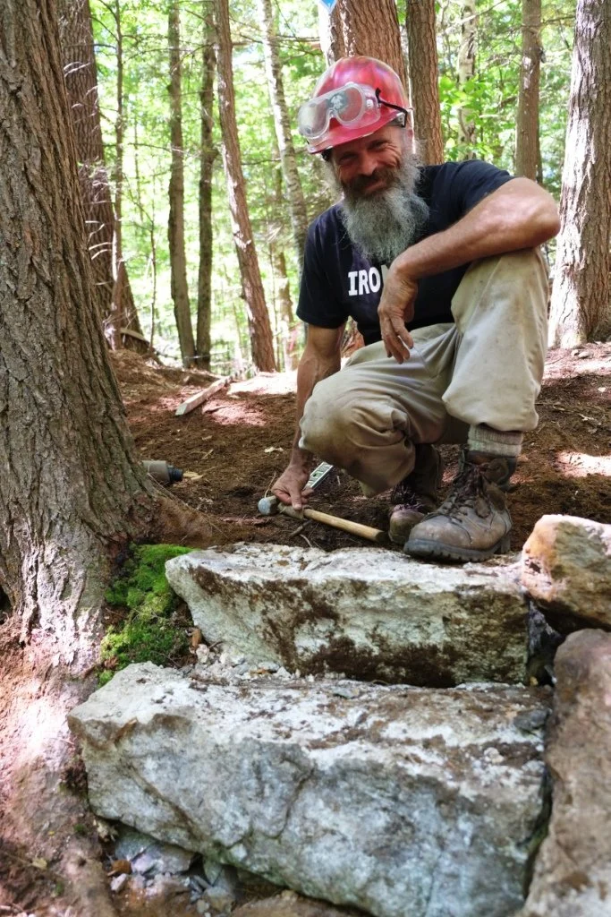 In 2009, Robert, now known as Ironbob, joined the NYNJTC as a volunteer on the project rerouting the Appalachian Trail on Bear Mountain. There he met Chris Ingui, volunteer coordinator for the NYNJTC, and Eddie Walsh, owner of Tahawus Trails. He learned the craft of dry-stack stone masonry under Eddie’s and Chris’ tutelage and fell in love with trail work. The following year he met and befriended Arturo Hidalgo on the same project.