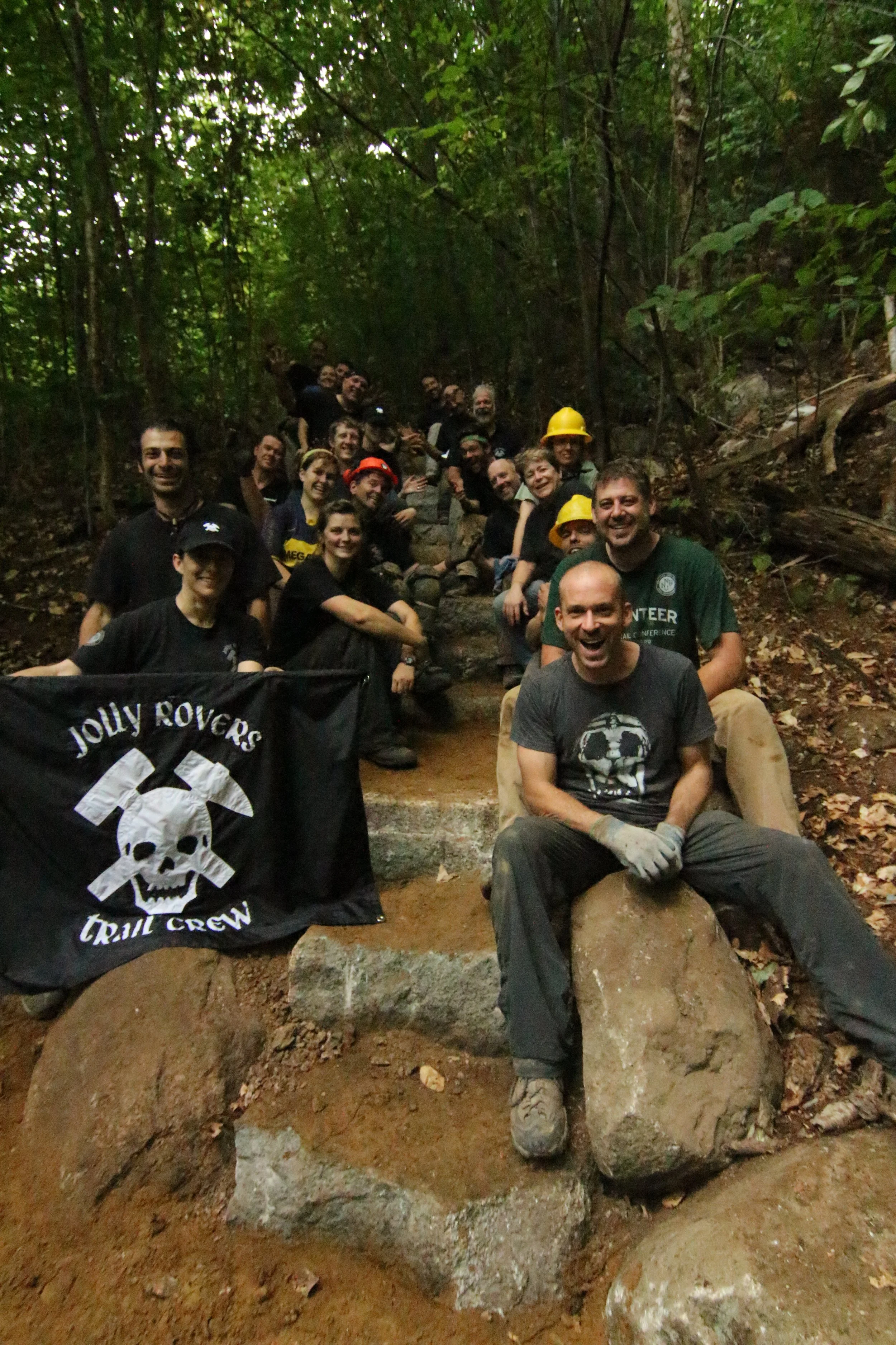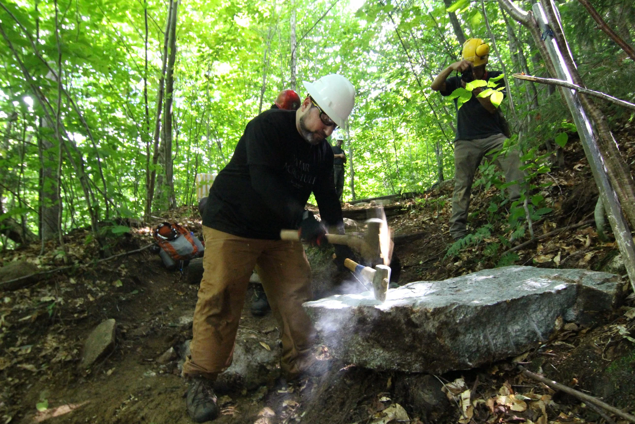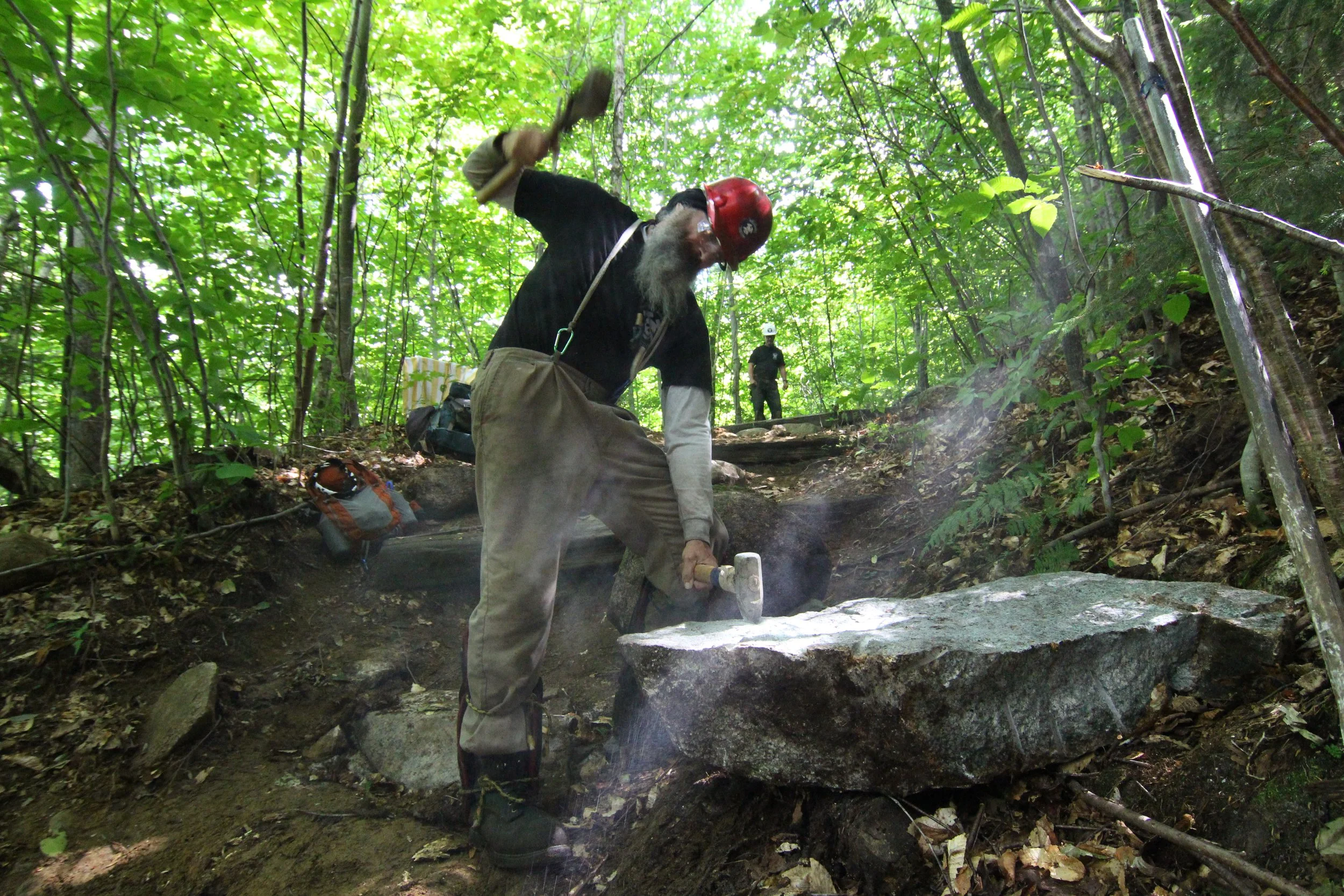 In the fall of 2013, the United States Forest Service approached the Jolly Rovers to rebuild a section of the Champney Brook Trail on the way up the famed Mount Chocorua. On this particular route to the summit, several stunning attractions in the form of a series of waterfalls, pools and vistas attracted more visitors than the summit itself. At the junction where visitors could go left to enjoy the various vistas and waterfalls or go right to shoot straight for the summit, the conditions of the trail had become particularly poor and also confusing for visitors. After a scouting trip to plan logistics for the large scale mobilization effort, the Jolly Rovers partnered up with the United States Forest Service for the first time in it's history.