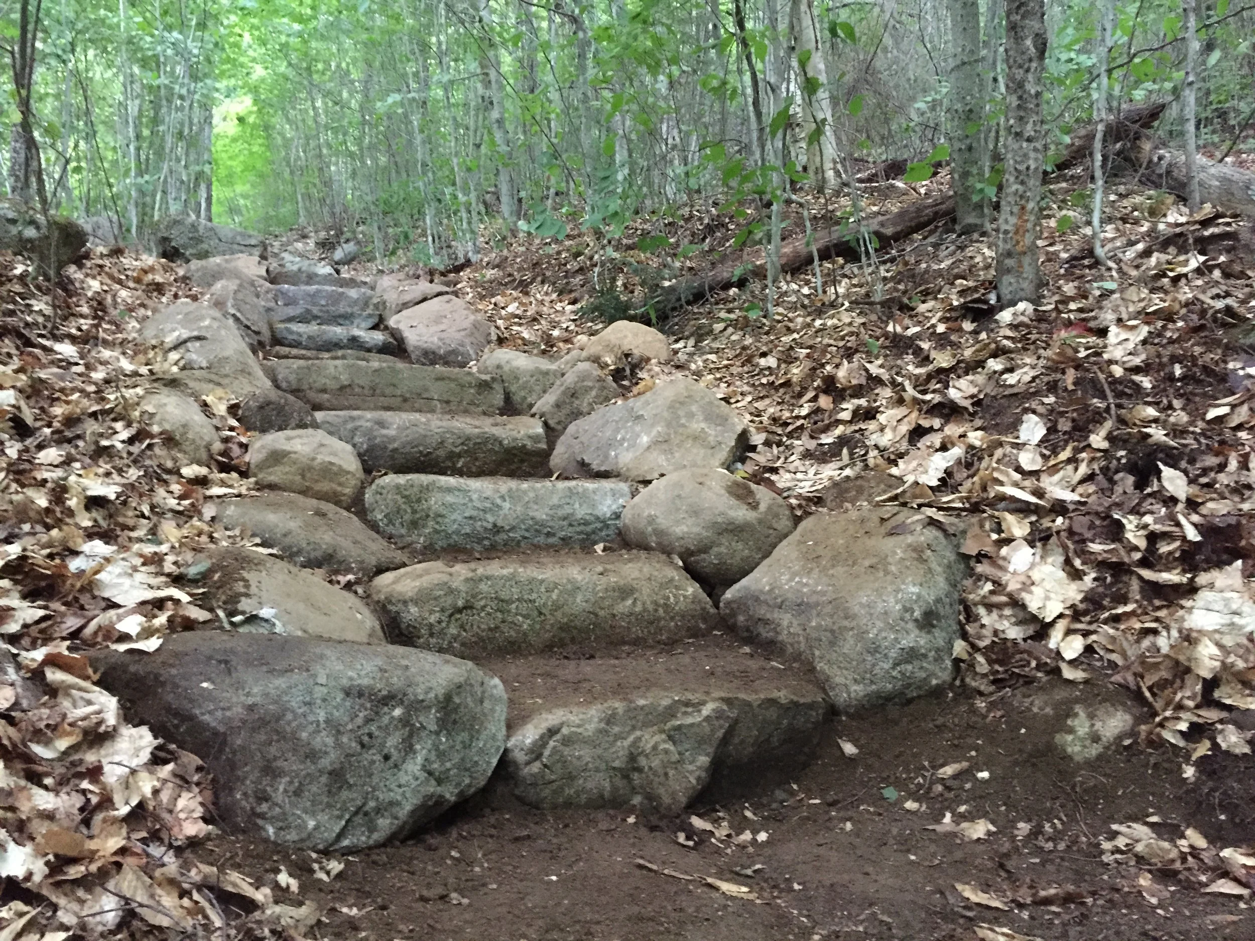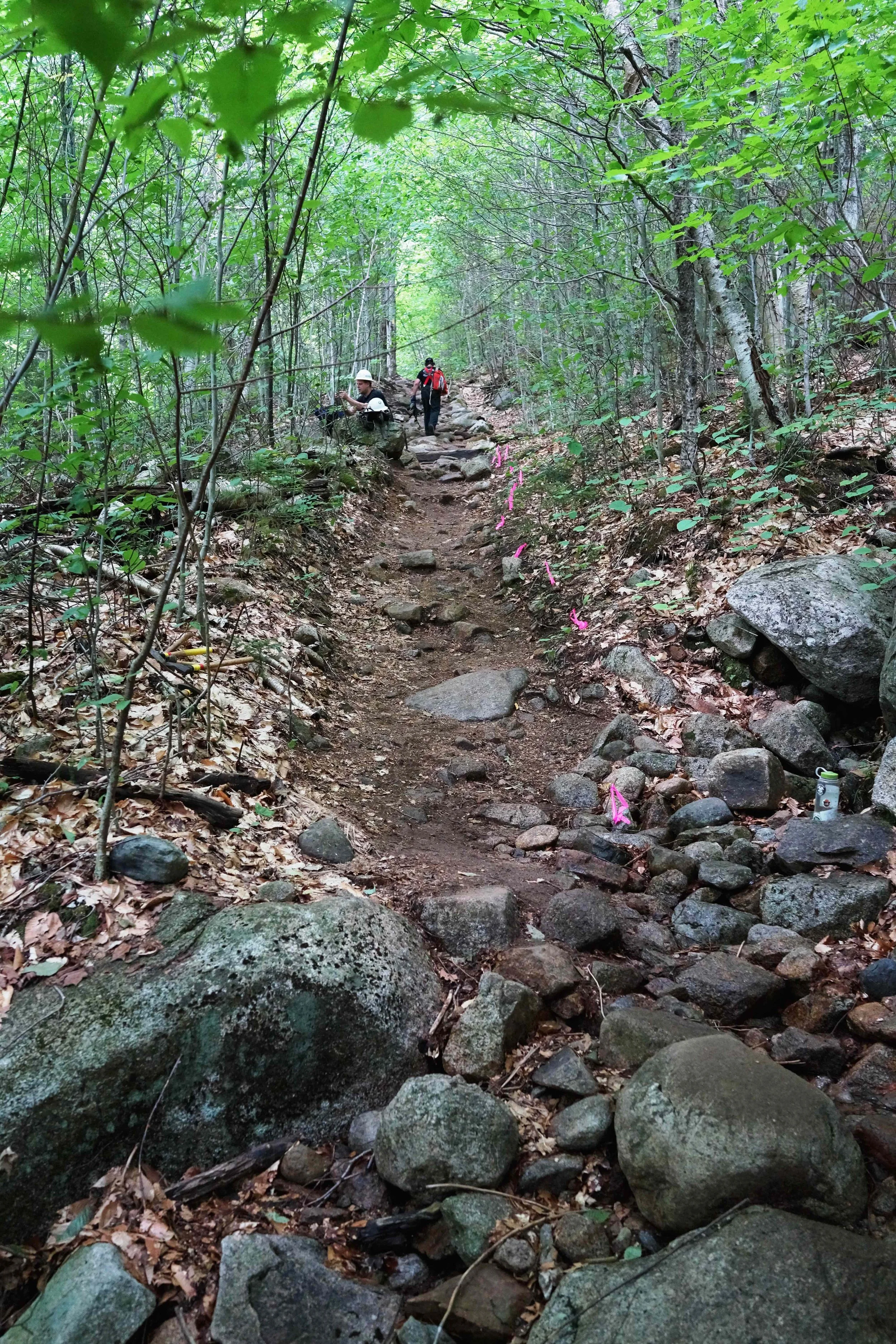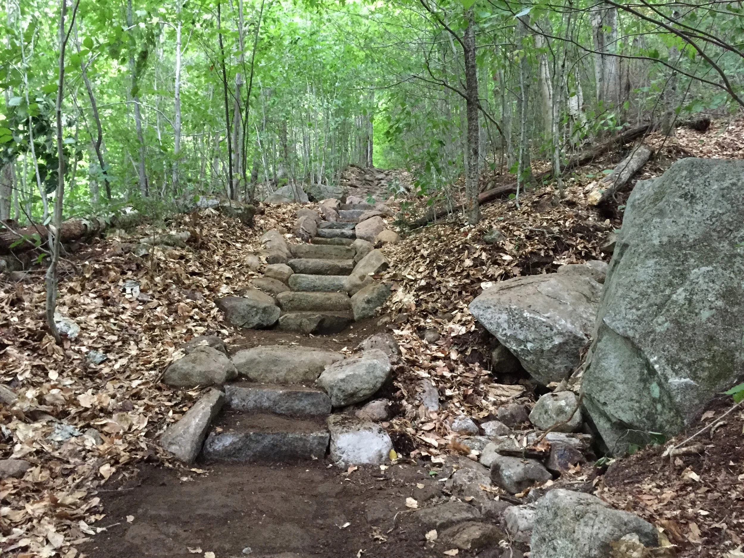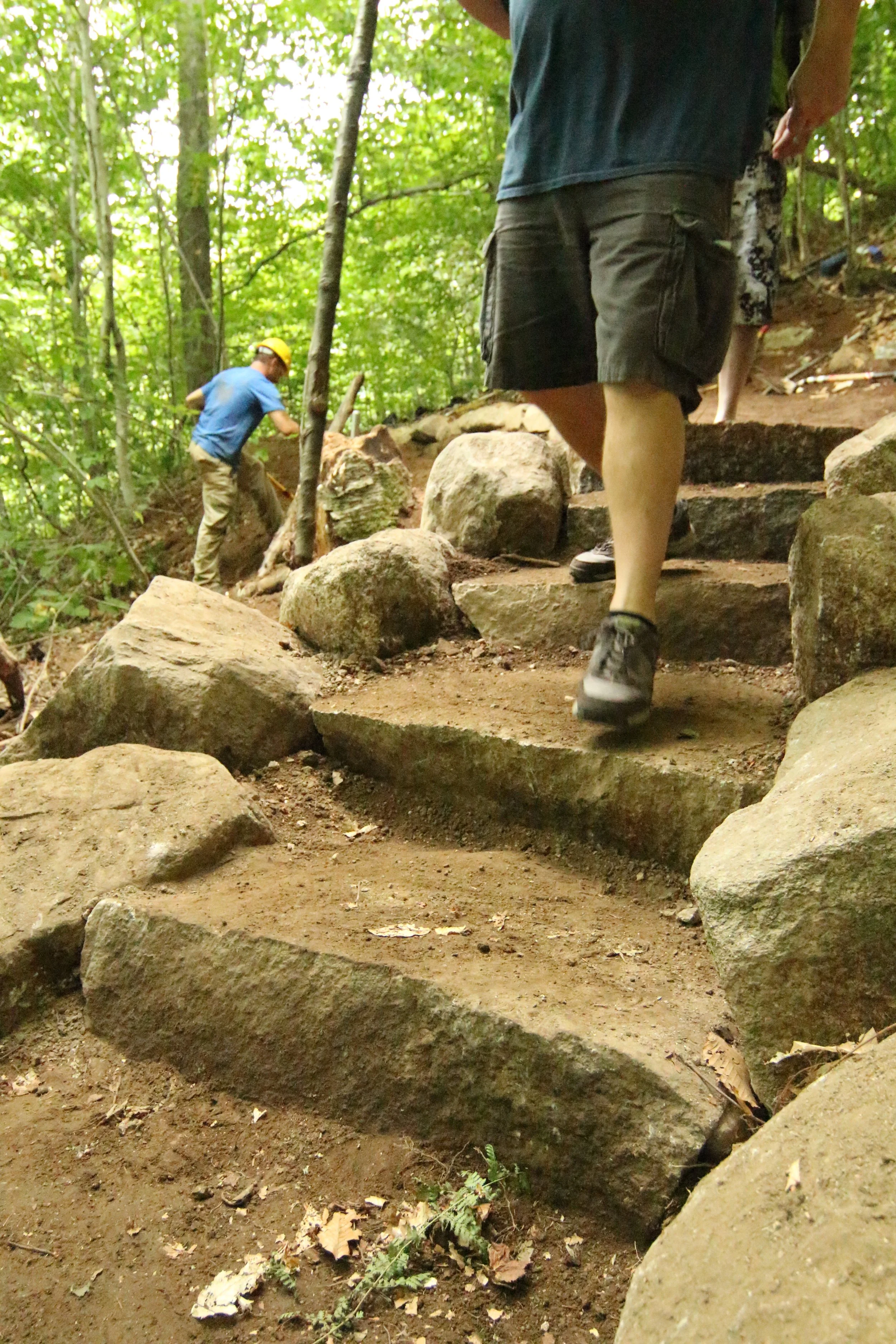 The total project resulted in over 50 stone steps, 30 feet of stone wall and one stone paved swale to intercept seasonal water flow across the trail. After some additional revegetation at the junction along with some signage, visitor confusion of where to go along with the issues of erosion at that particular location ceased. In such a beautiful location, with the magnificent White Mountains around us, we could not have asked for a better trip.