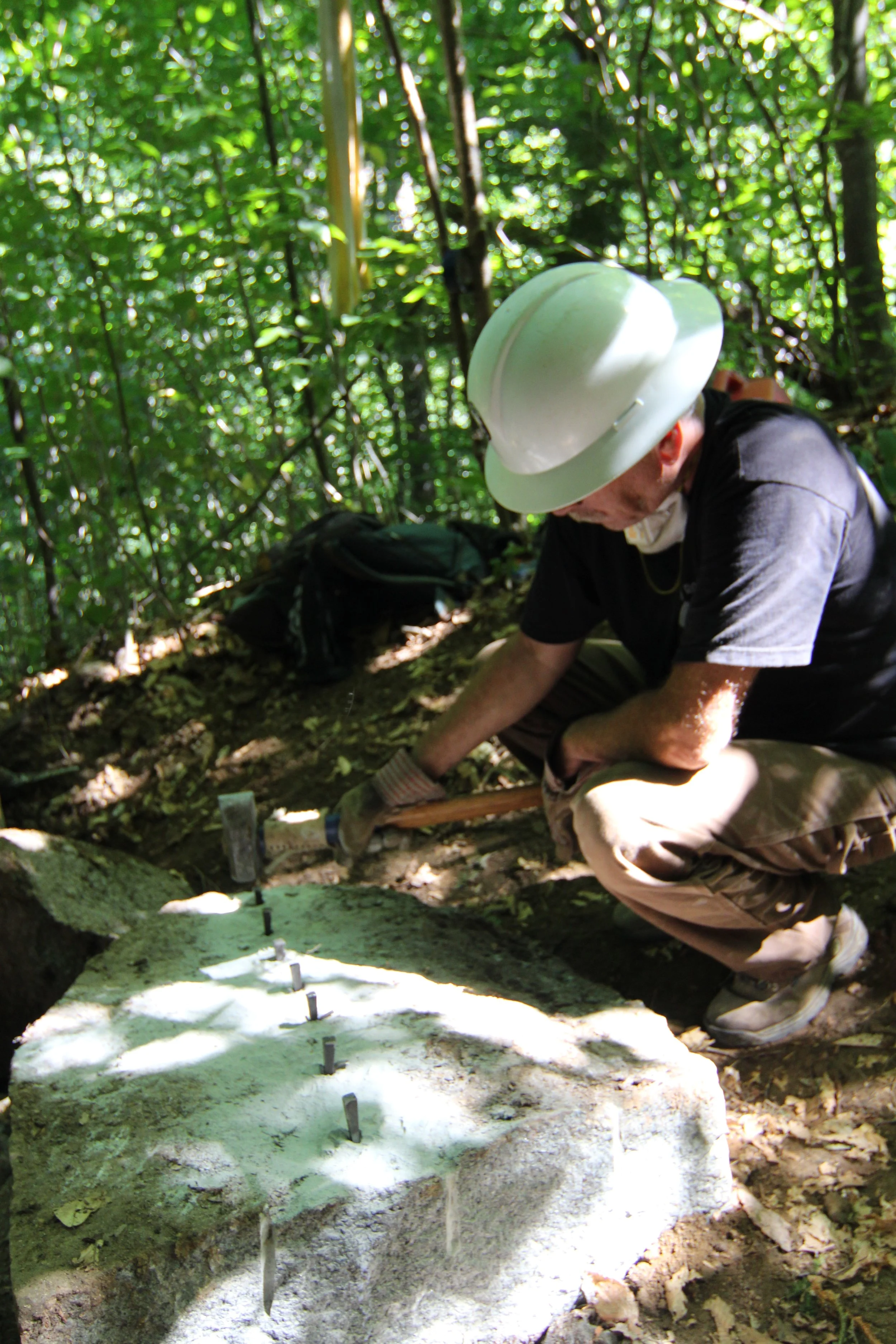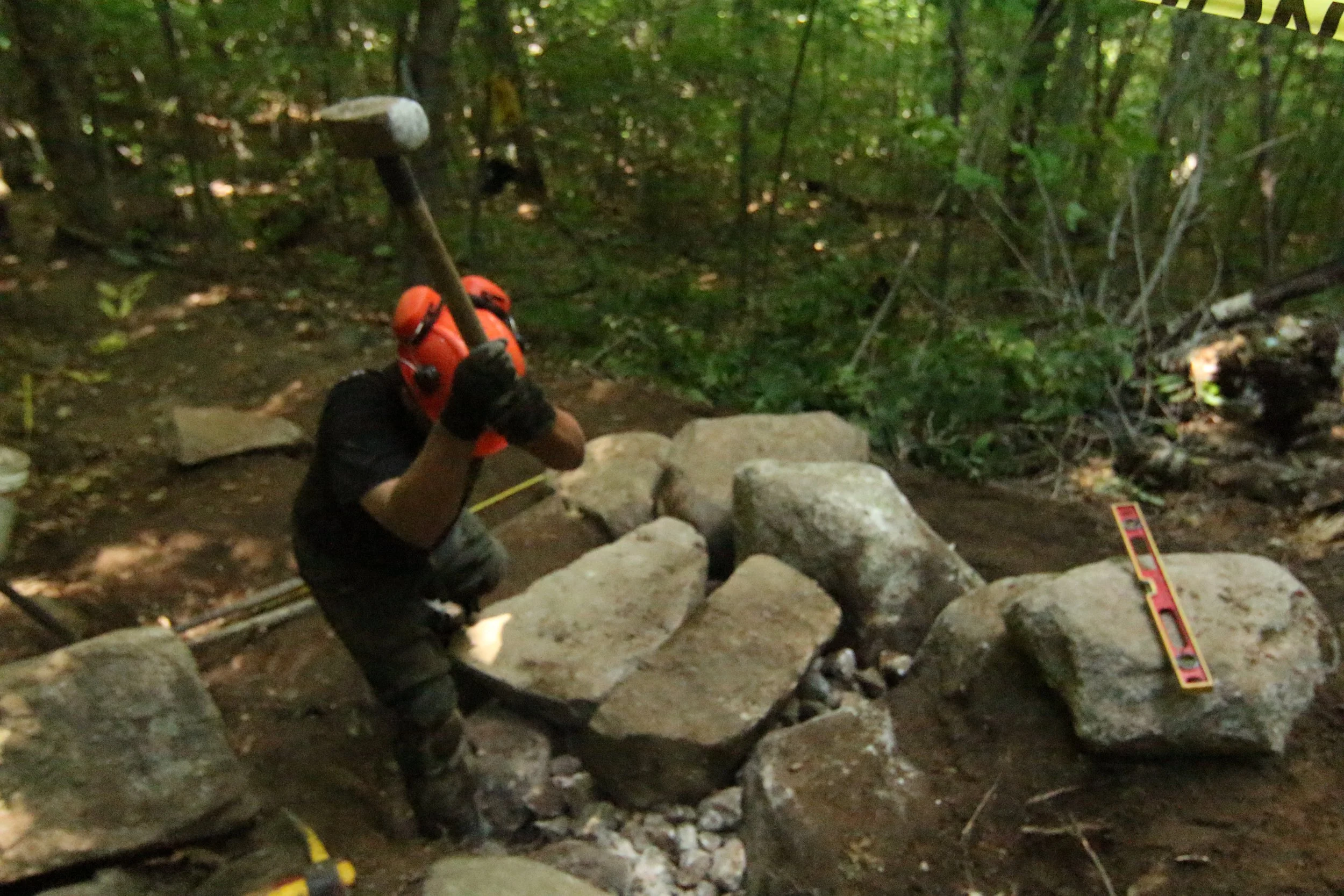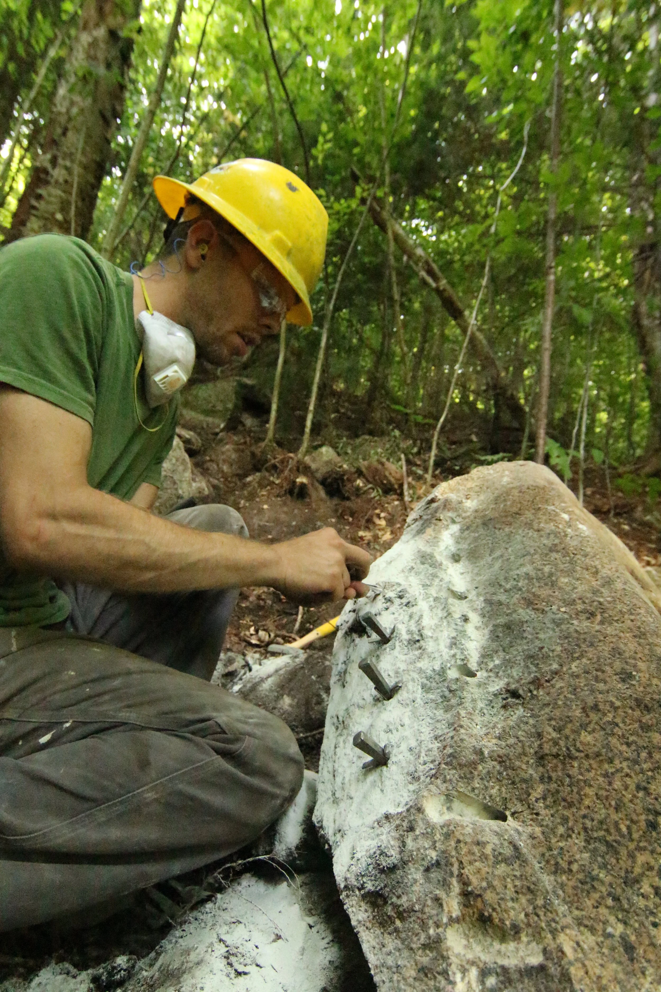 Once there, the granite found onsite was not only abundant but very agreeable to split and shape, allowing our crew to work efficiently by harvesting almost all the necessary steps out of two large boulders uphill. The surrounding scree stones would then be harvested utilizing a series on overhead zip lines to deliver the rocks to their various teams.